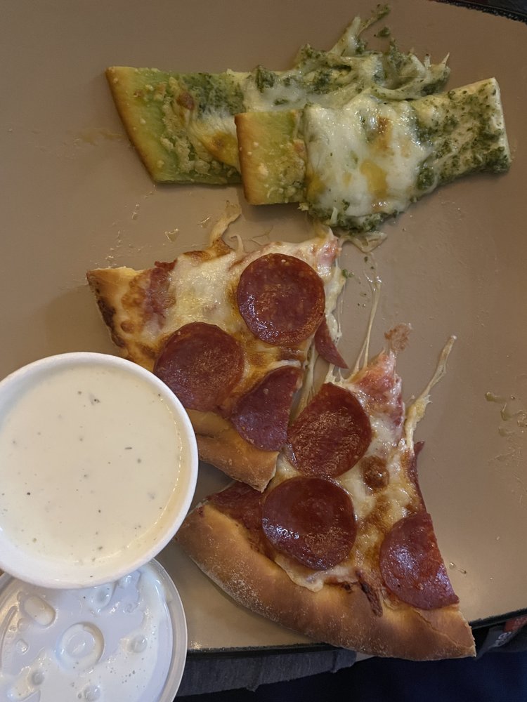 Homemade pizza dough topped with garlic butter and cheese, served with a side of meat sauce or ranch dressing for dipping